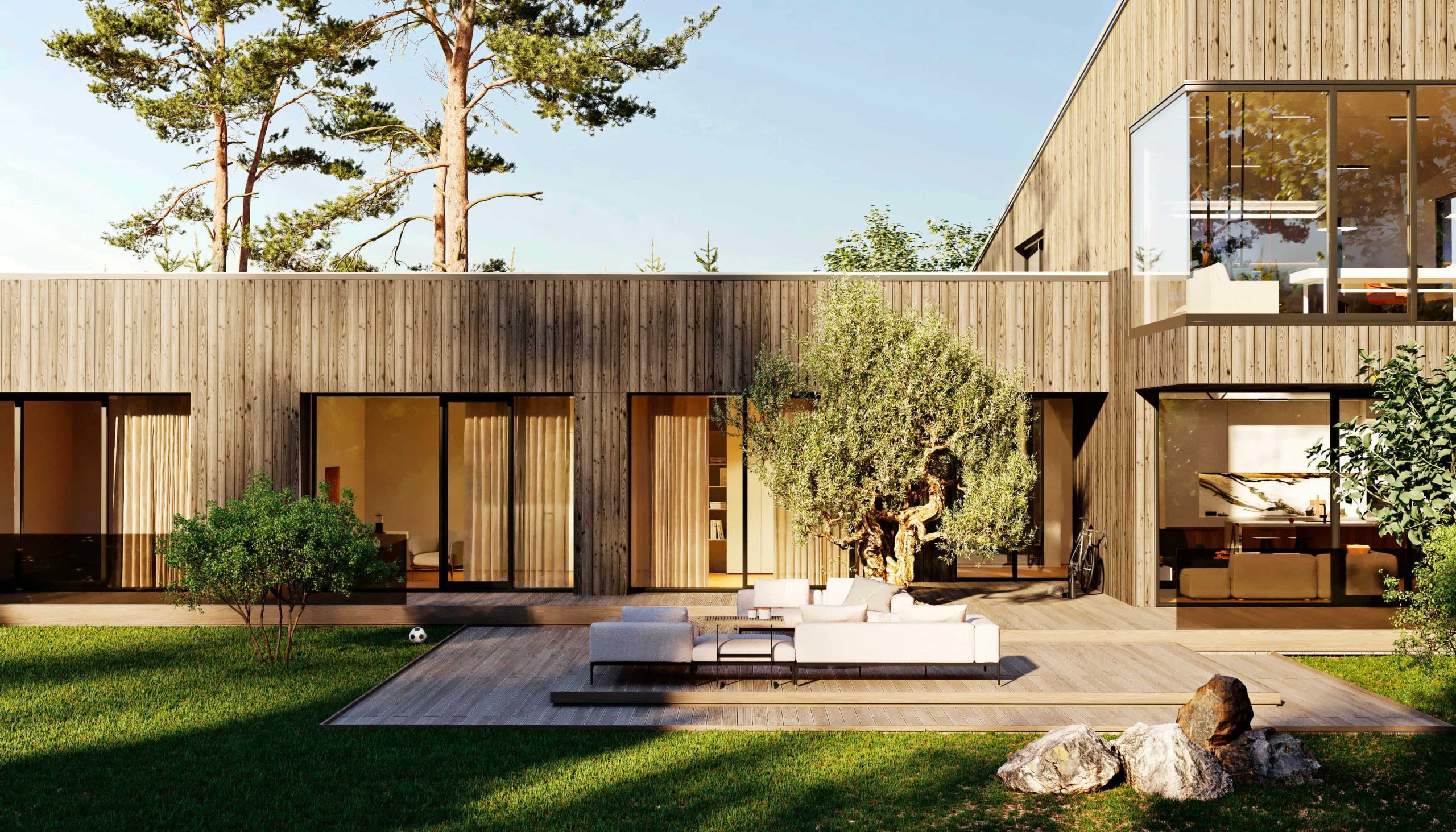 Abgeschiedene Aktivitäten wie Yoga, Meditation, eine finnische Sauna und ein offener Bereich in der Natur für Sport und kreative Tätigkeiten – all das wurde so gestaltet, dass Sie das maximale Vergnügen am Leben außerhalb der Stadt genießen können.